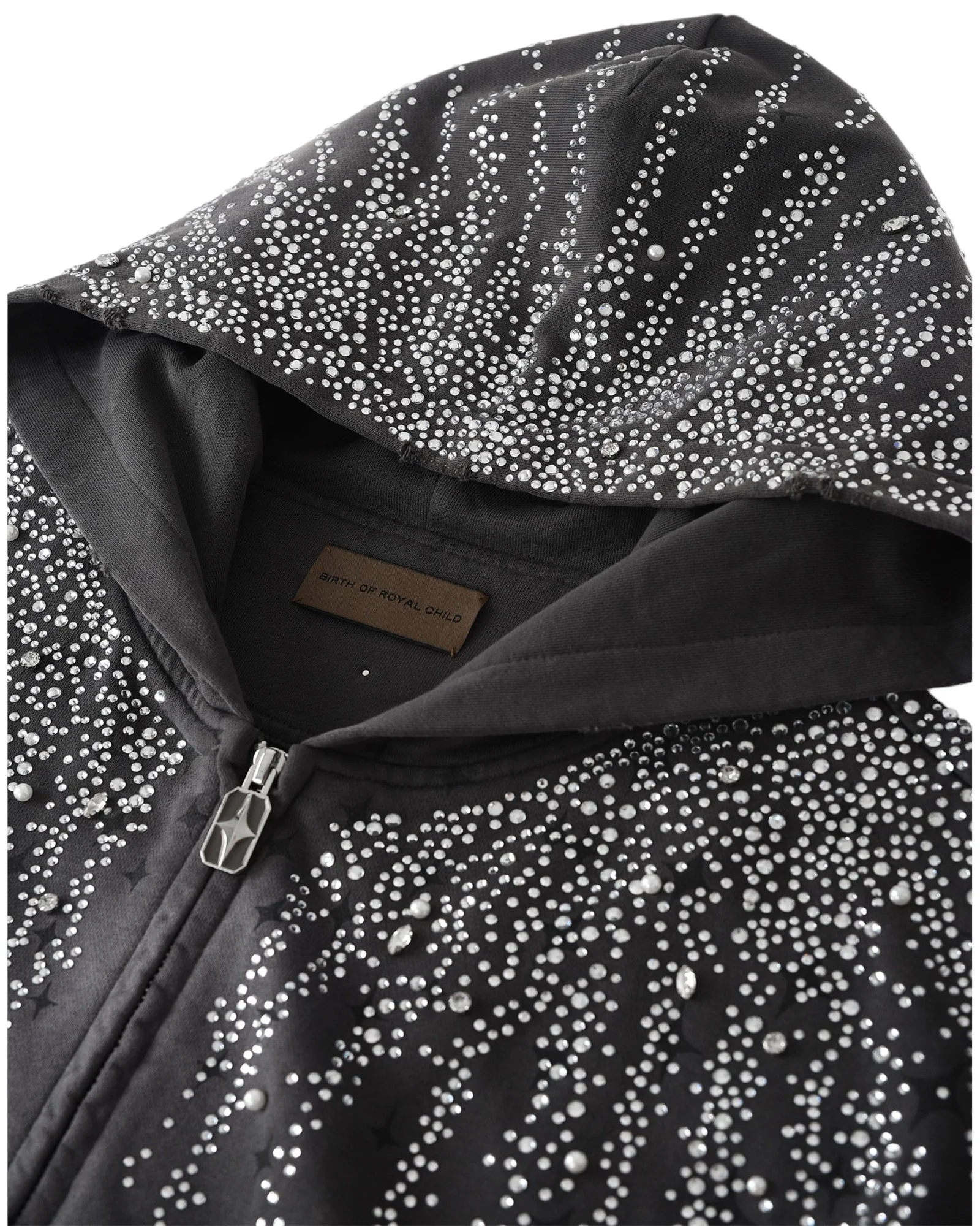 The Birth of Royal Child 20K Stellar Diamond Hoodie In Black shines bright with is opulent design featuring thousands of sparkling rhinestones and beautiful pearls that gracefully rain down from the hood and shoulders. The heavyweight fleece hoodie has a heavy wash treatment for fading and distressed detailing for a well-worn look.