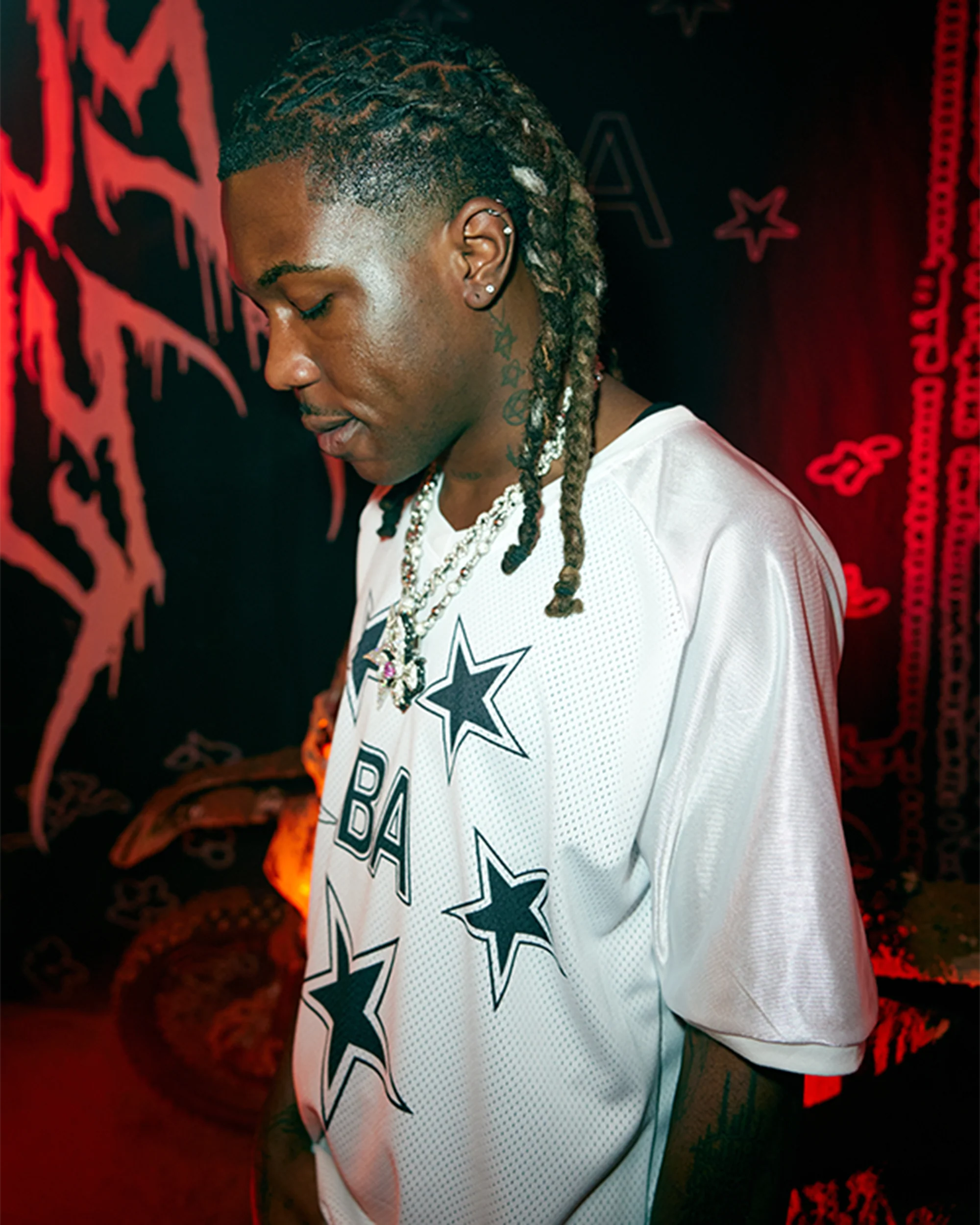 A piece of official Destroy Lonely merch, the BBY$ Big Star Futbol Jersey in White showcases the rapper's distinct, bold style. The white soccer jersey features front, black, and sleeve graphics in black.