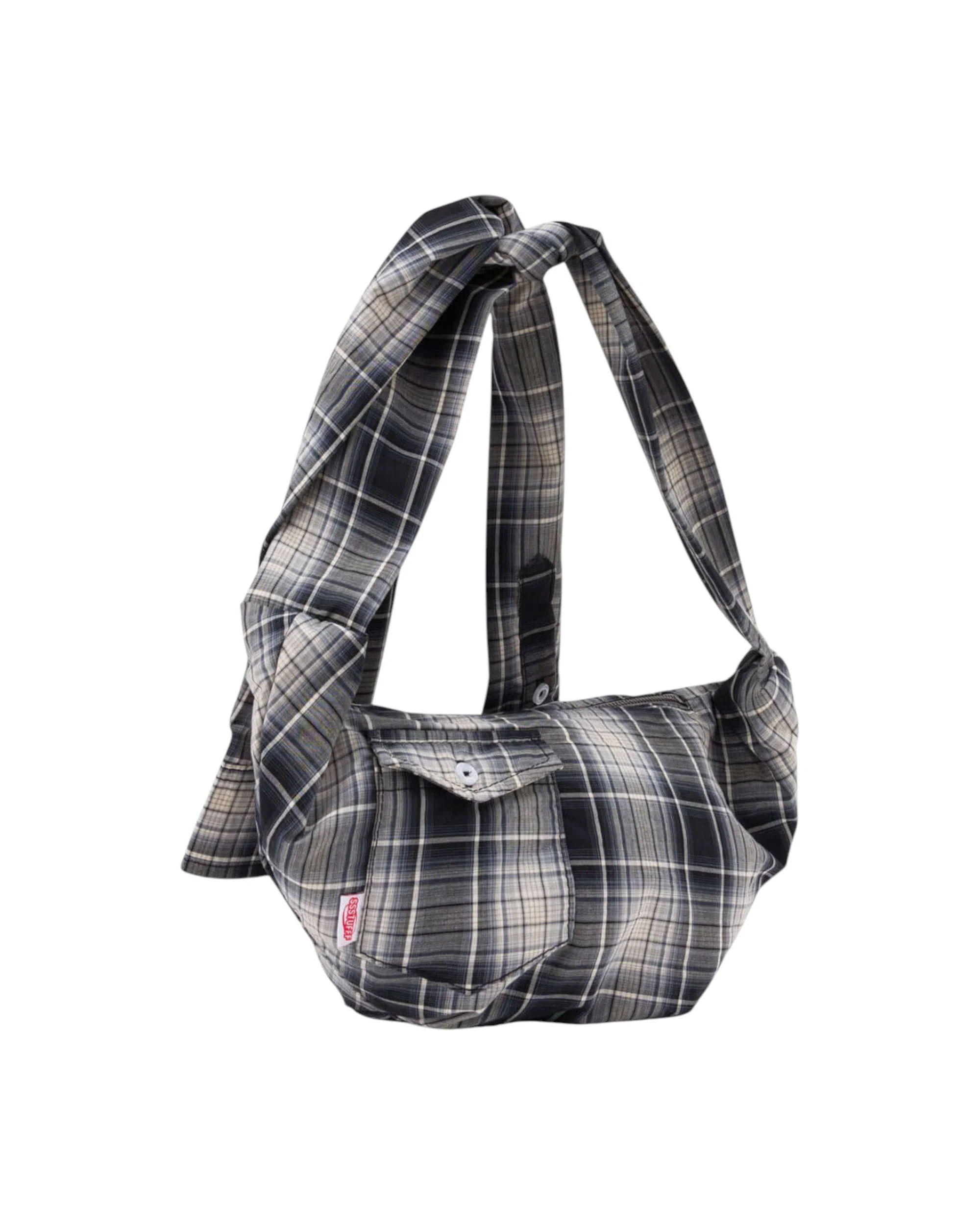 The SSSTUFFF Shirtsleeve Bag is a sling bag designed to look like a button-up shirt sleeve that has been tied up. The black-and-white checkered bag can be worn over the shoulder or across the body and there are multiple ways to tie the shirt sleeve/cuff handles. The bag is sized to hold all your daily accessories and can fit up to a 16-inch laptop.