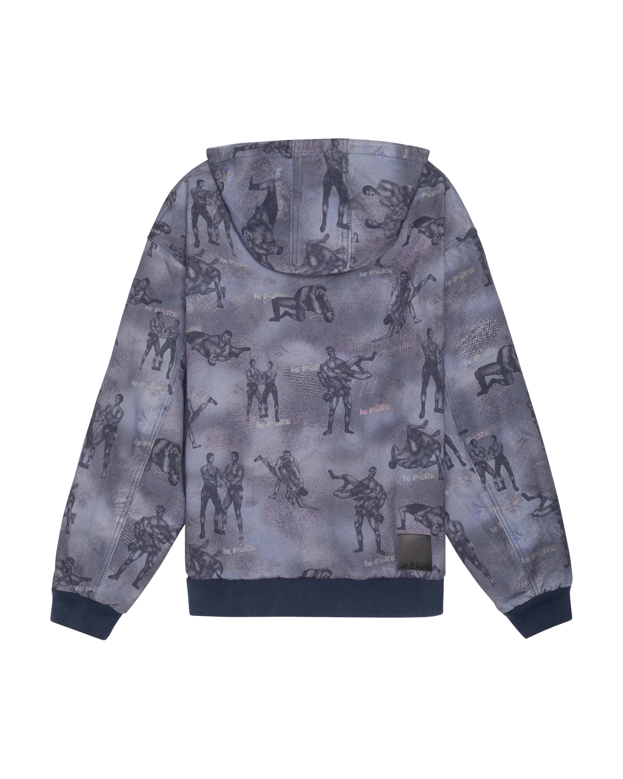 The le PÈRE Cherry Hooded Jacket is a premium hooded sweatshirt designed in collaboration with Cherry Kim. The sweatshirt features a repeated print pattern of wrestling characters that Cherry hand-drew for le PÈRE. Traditionally a delicate French artistic and fabric framework, this repeat print pattern is inspired by toile de jouy and re-interpreted here as a hunter's camouflage outfit.