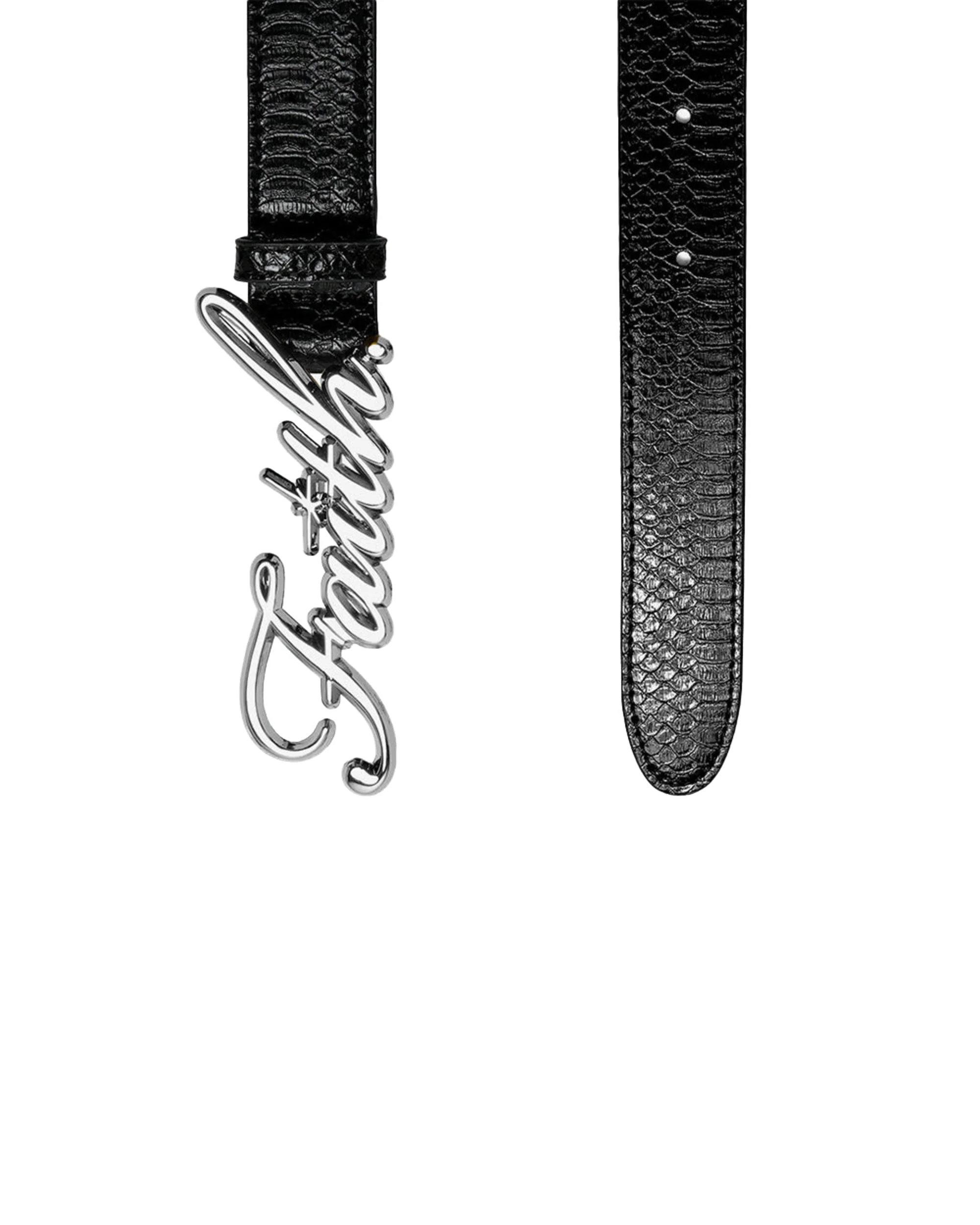 The Faith By Luis Chrome Faith belt is a premium handmade belt by the upscale ready-to-wear brand. The belt has a black faux leather construction with a shine finish and embossed snakeskin pattern. The centerpiece of the belt is a chrome finish zinc alloy 'Faith' belt buckle.