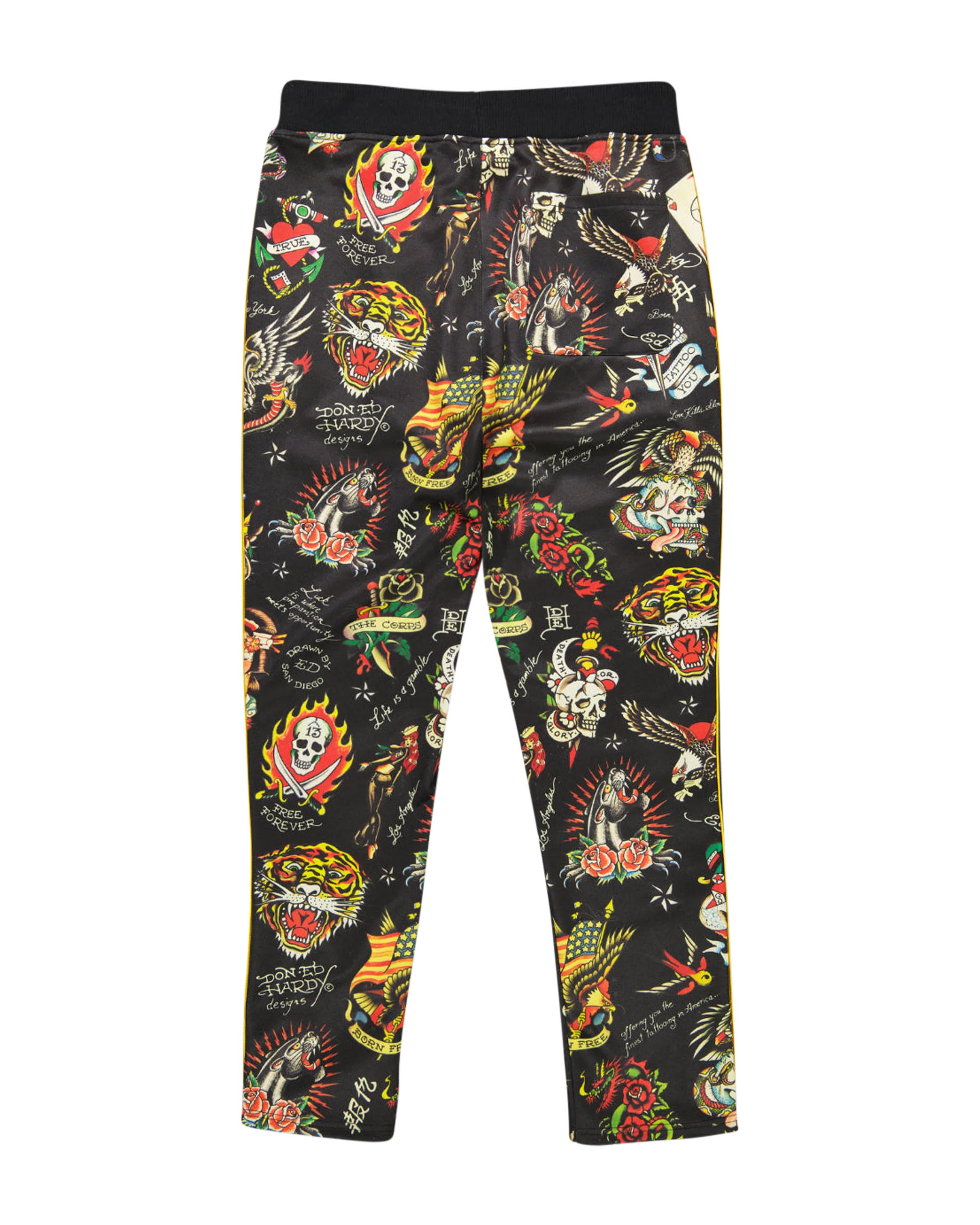 The Ed Hardy Flashboard Trackpants feature an all-over print of many of the legendary tattoo artist's most iconic illustrations. Constructed in a retro-inspired polyester tricot fabric, the head-turning track pants are finished with contrast piping down each leg and rubber-tipped drawcords.