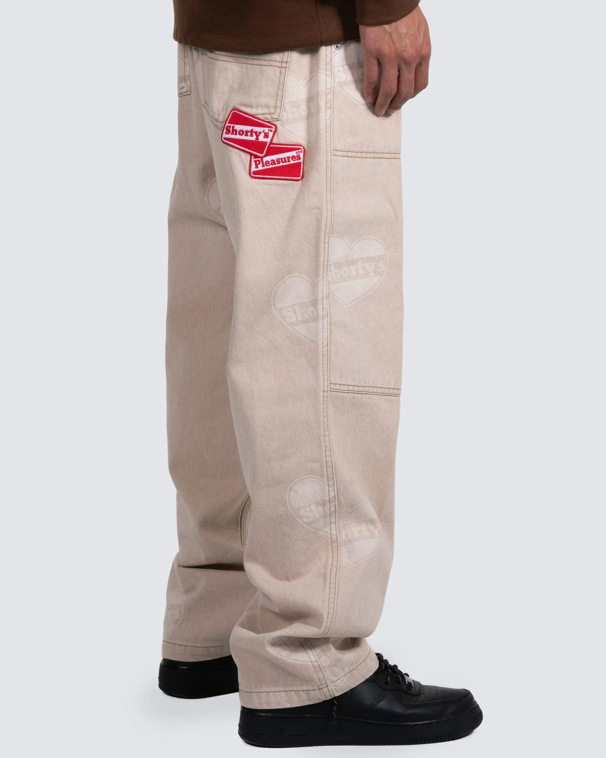 The Pleasures x Shorty's Heart Ultra Work Pants are a standout piece from the limited edition collaboration from the streetwear label and classic skateboard brand. The loose fit work pants feature an all-over printed Shorty's heart logo with dual Shorty's/Pleasures logos embroidered at the back right pocket.