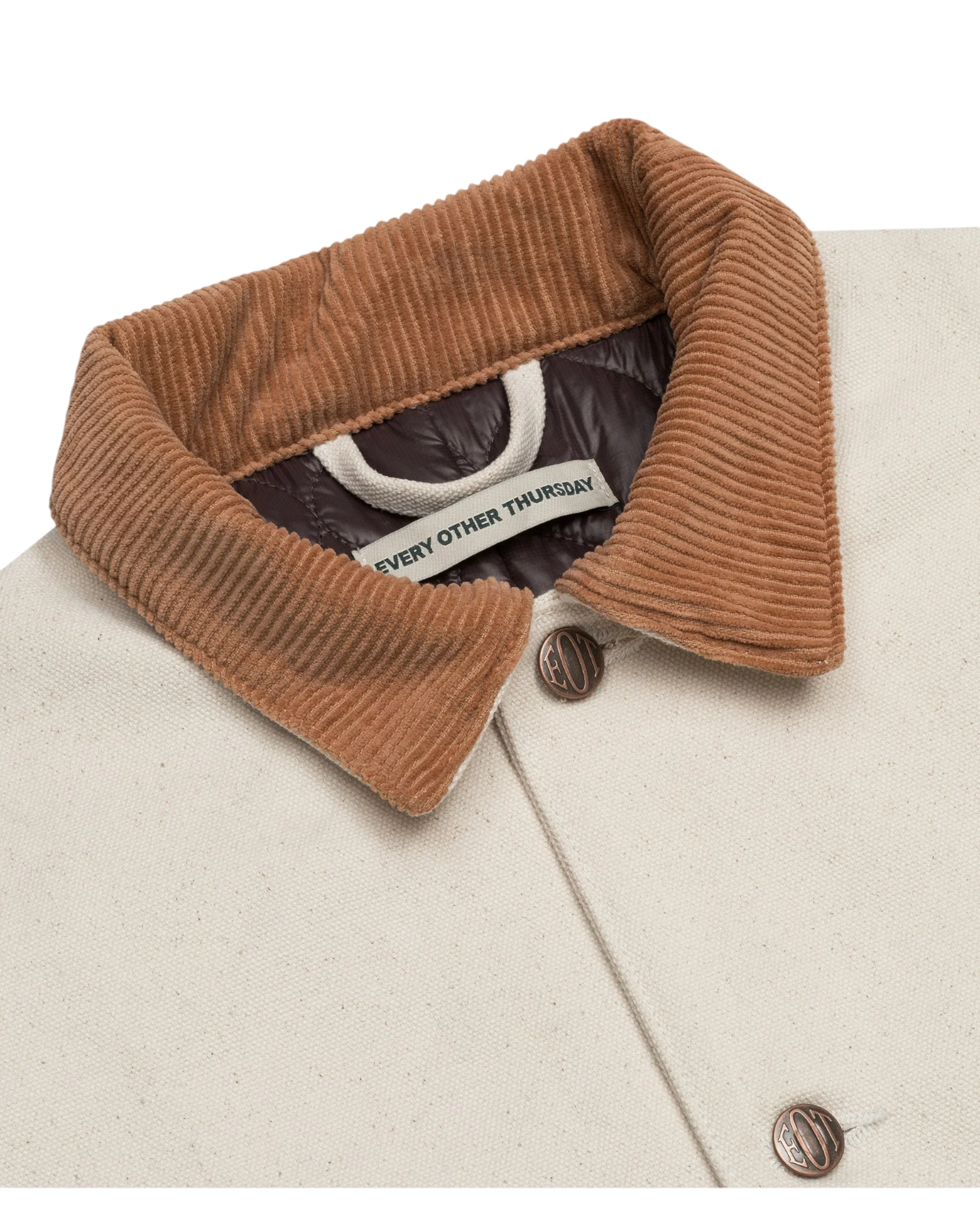 The Every Other Thursday Heavyweight Chore Coat is made in the USA from 100% cotton canvas and pre-washed to help speed up the break in period. The premium outerwear piece is completed with a quilted nylon wool insulation, contrasting corduroy collar, and classic EOT custom brass buttons.
