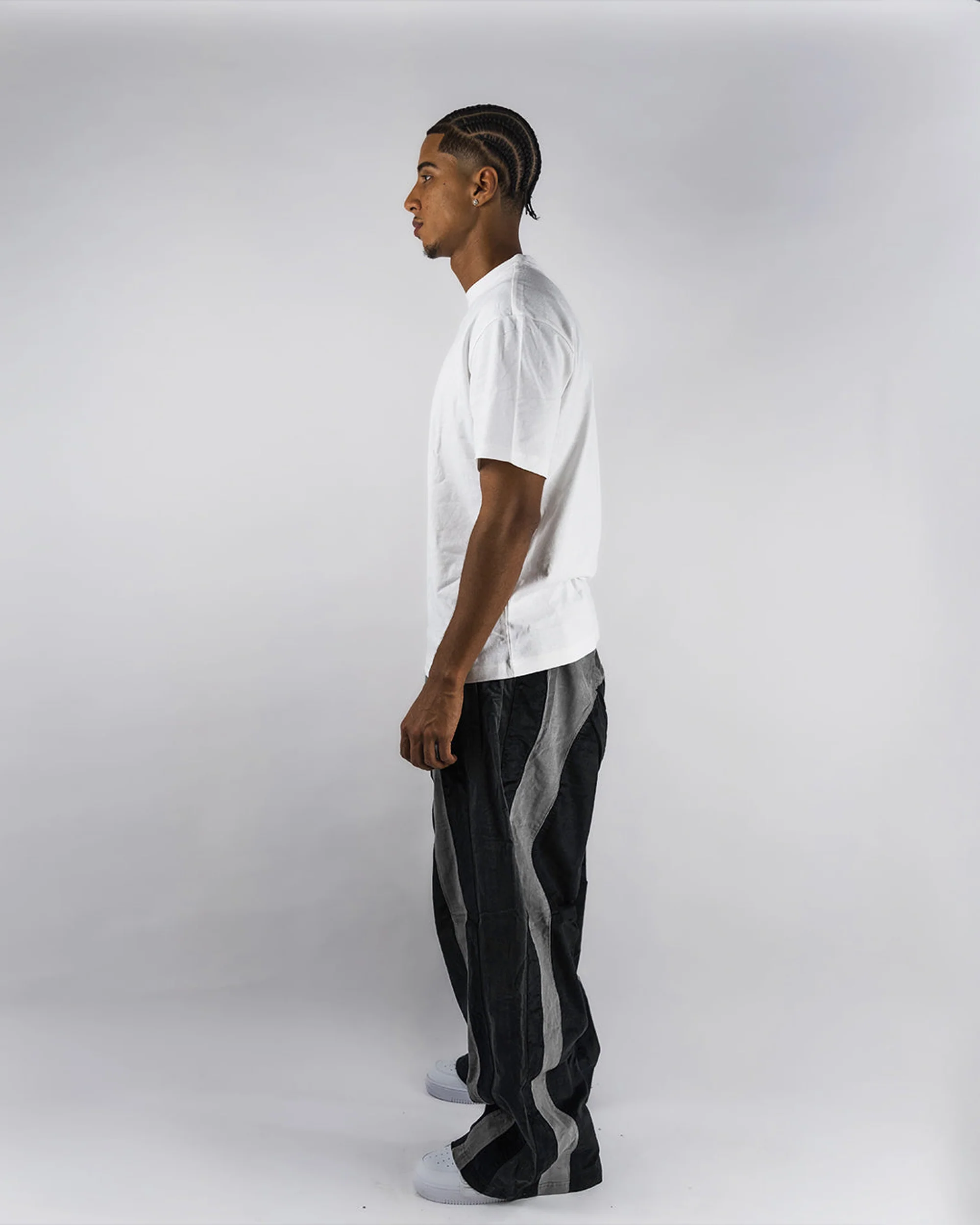 Visionary Club's Radiant Aura Wide Leg Sweats are featured here in a black "Pokerface" colorway. The bold yet laid-back sweats are constructed in high quality corduroy with a loose, wide leg fit.