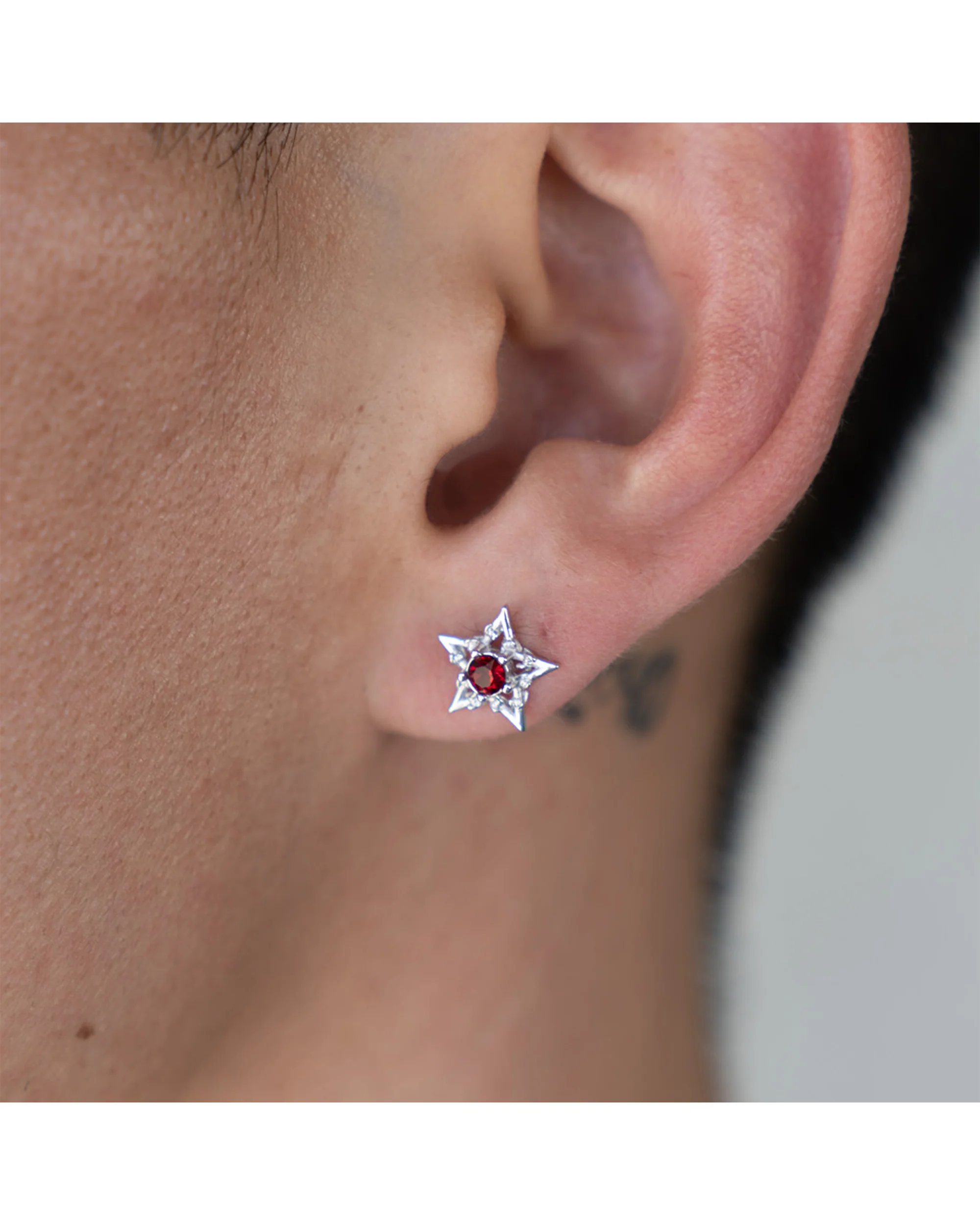 The Red Barbwire Star Earrings by Pythia are crafted from .925 sterling silver and adorned with genuine Swarovski crystals. Each pair ships with a custom Pythia case.