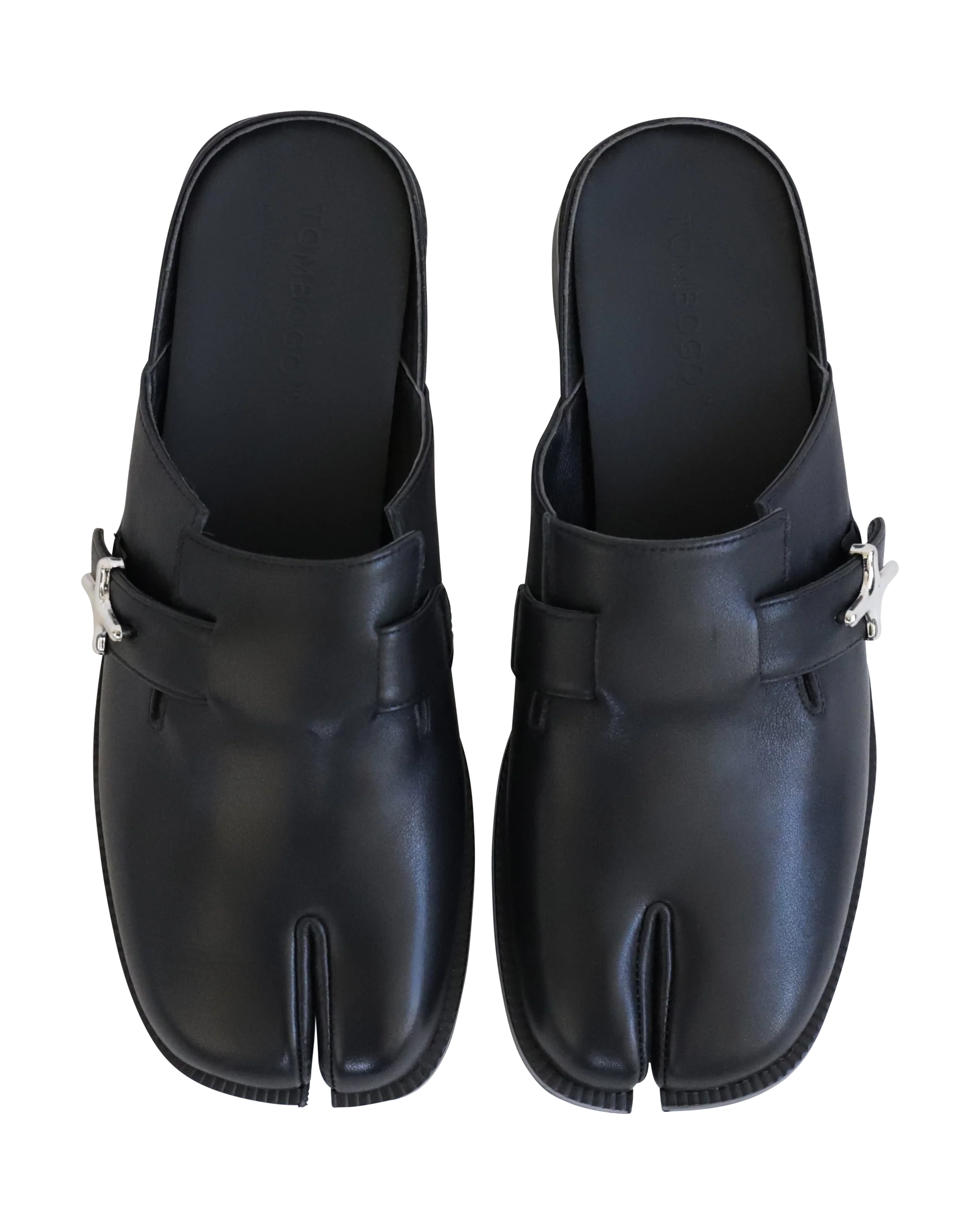 The TOMBOGO Tabi Swiper Mules are premium slip-on shoes constructed in top grain leather with sheepskin lining, a calfskin insole, and durable rubber outsole. TOMBOGO's signature + logo is utilized for the titanium buckles on the midfoot strap.