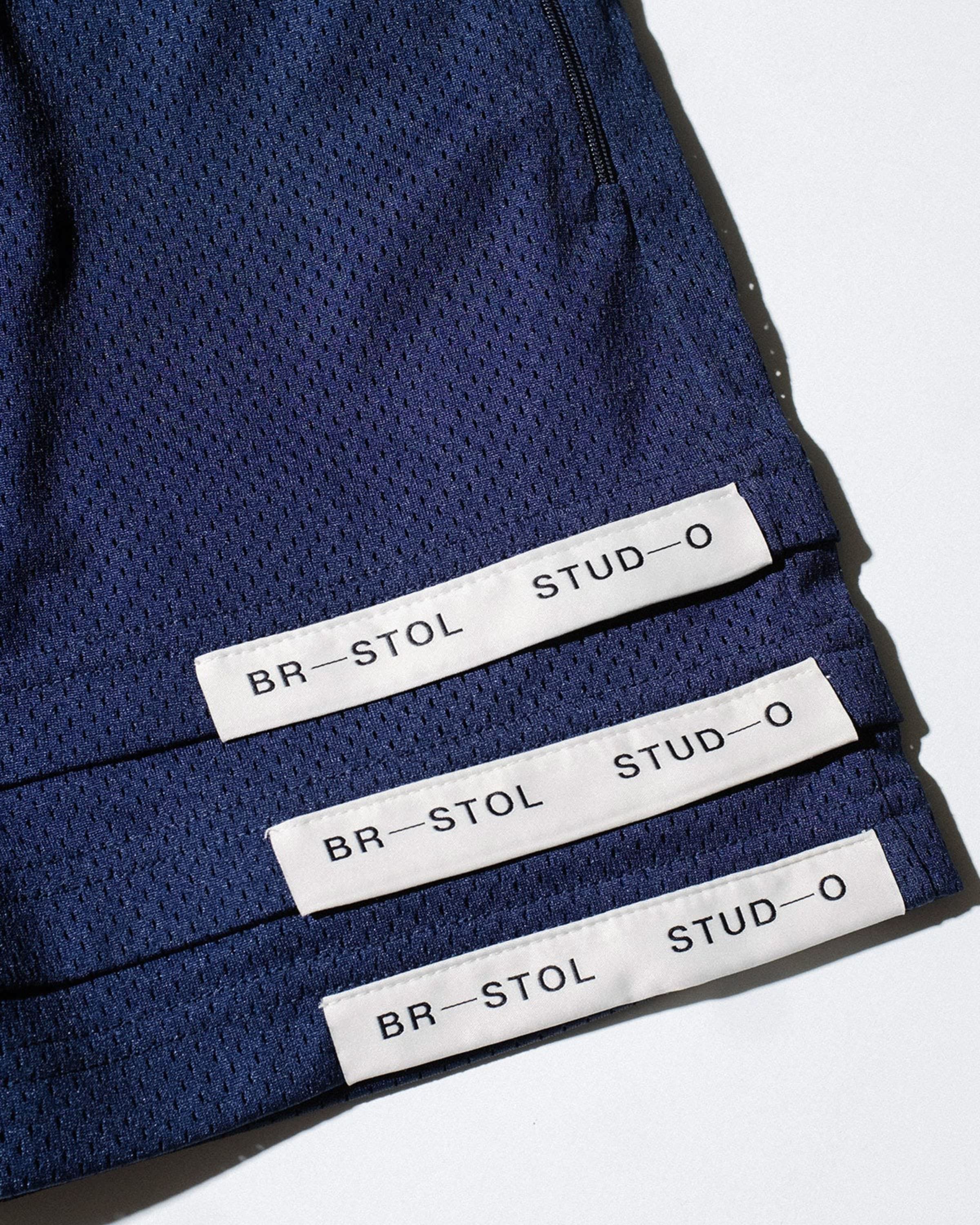 These polyester eyelet-mesh basketball shorts by Bristol Studio feature triple hem detail on either leg opening, a woven Bristol Studio label at each hem, and zipper pockets on both sides for safe keeping. This style has been updated with lightweight polyester tricot lining for a soft feel . An interior waistband drawcord allows for a comfortable custom fit. Made in Los Angeles.